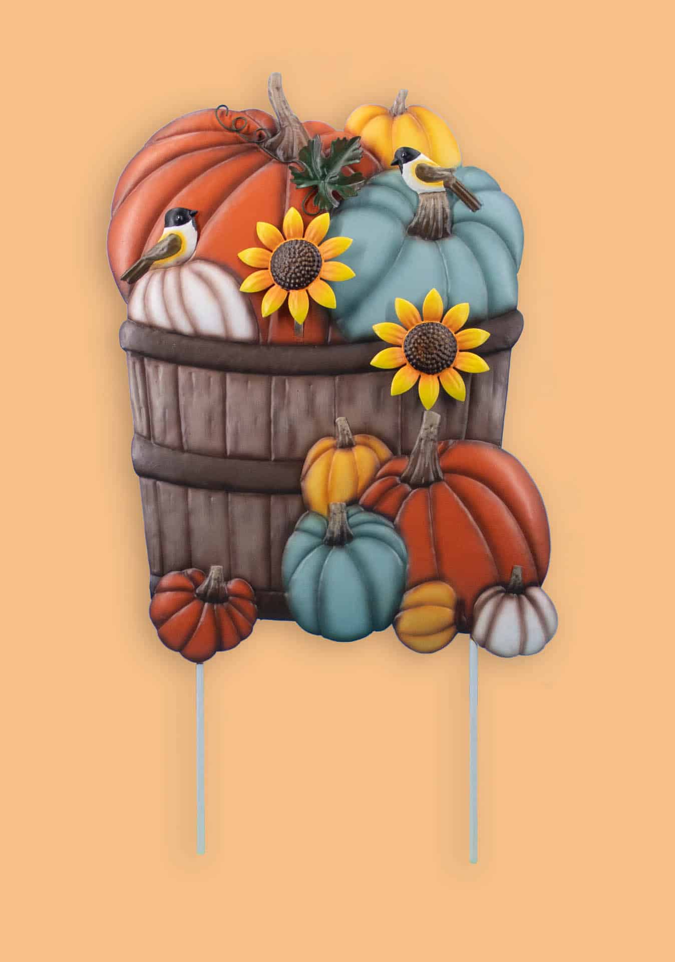 Basket, pumpkins w/ sunflowers, birds