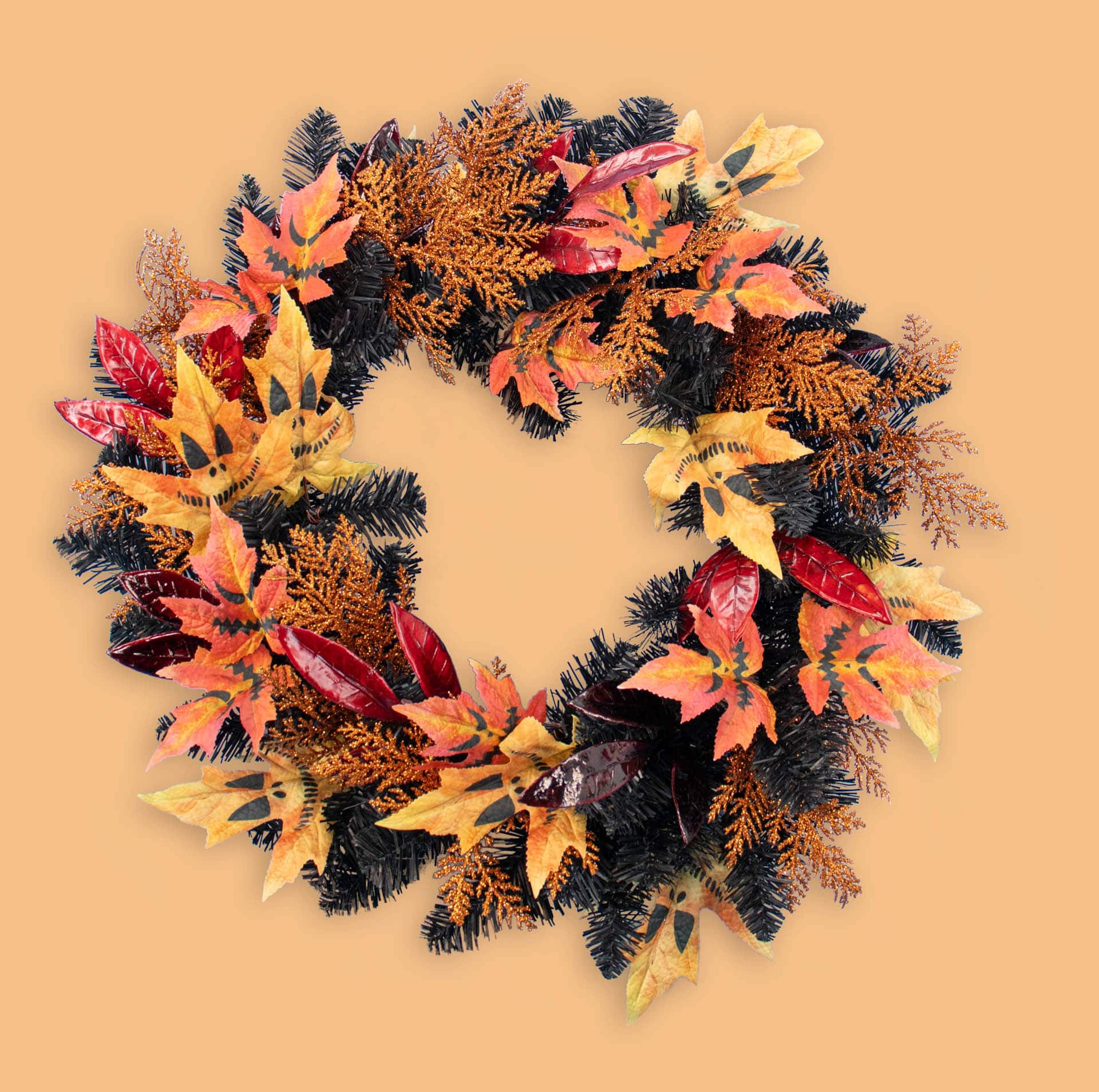 Components include black PVC pine, orange leaves with printed Halloween face, orange glittered cedar and red leaves