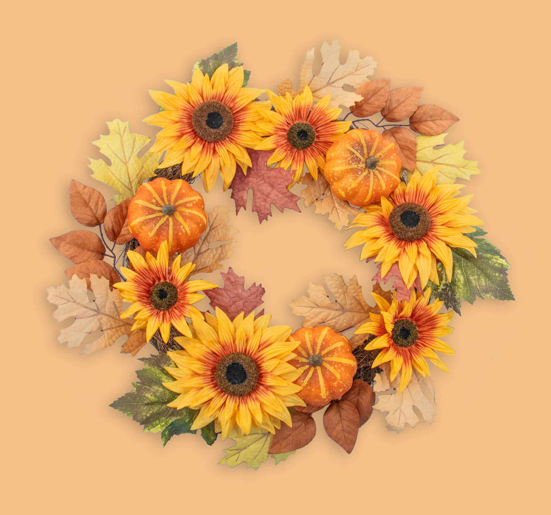 components include pumpkins, assorted sized sunflowers and assorted fall leaves