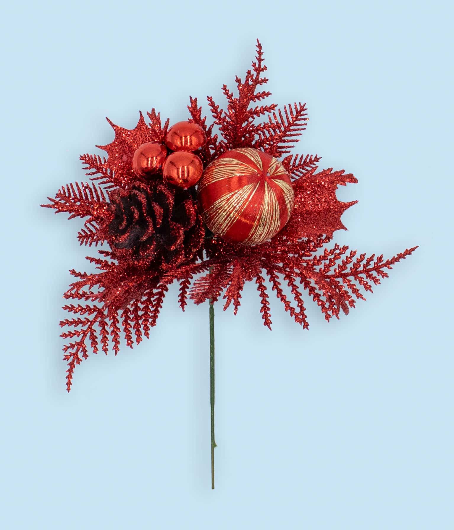 Components include red/gold swirl glitter ball, red shiny mini balls and red tipped natural pine cone over red fern and holly leaves
