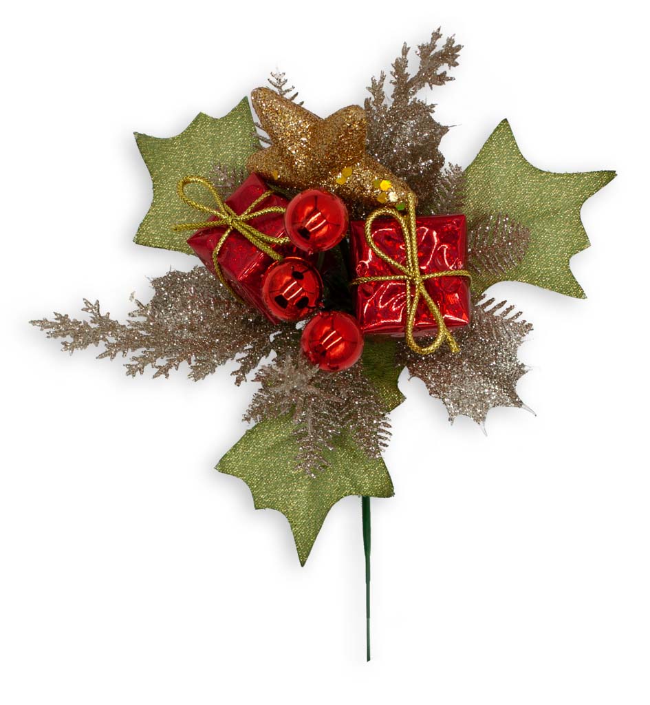- Includes red gift boxes, red shiny balls, gold glitter star, gold glitter star, gold/champagne glitter leaves and green sparkle leaves