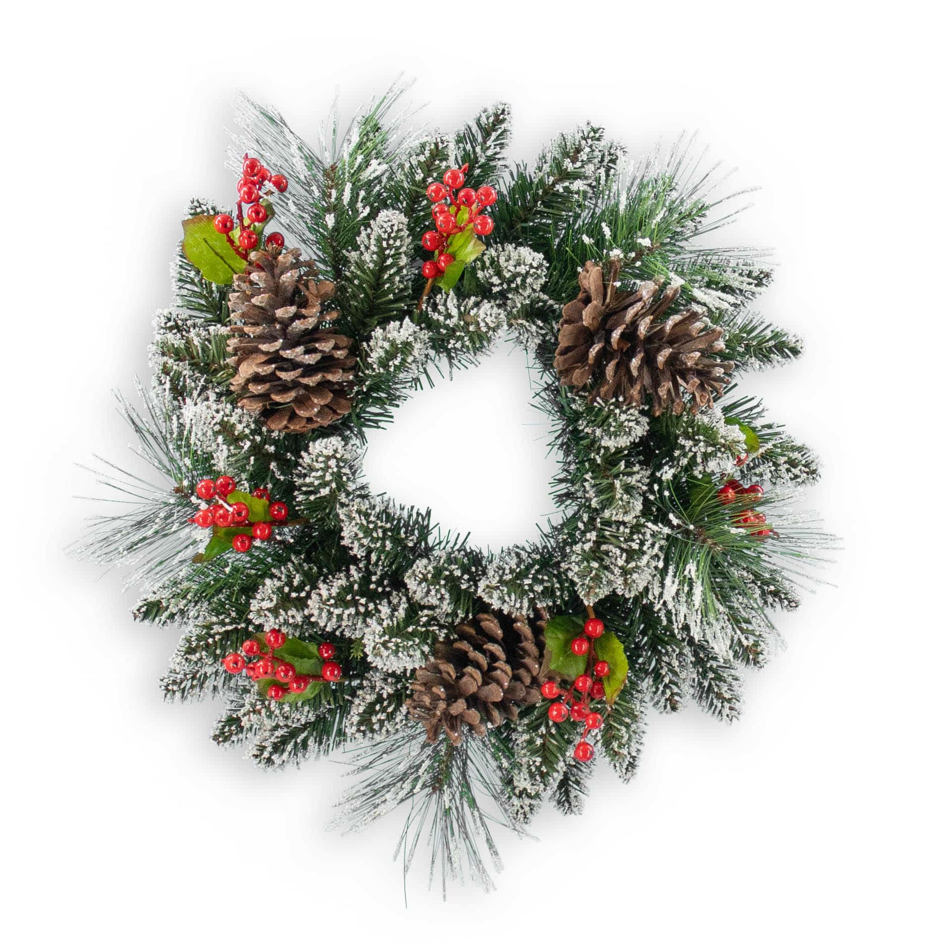 - 18" mixed flocked pine wreath with berries and pinecones