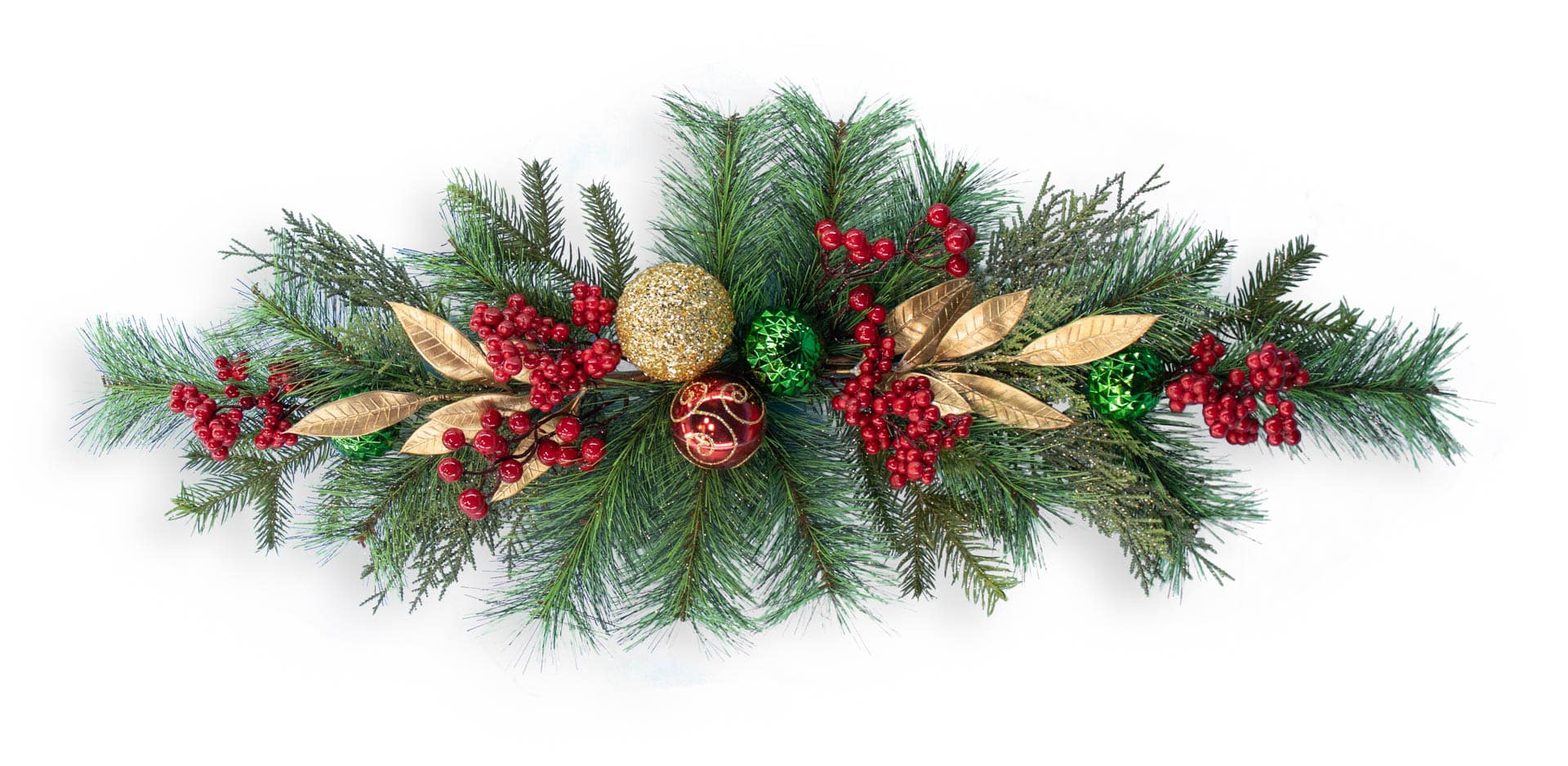 Components include pine, red/gold/green balls, red berries and gold leaf's